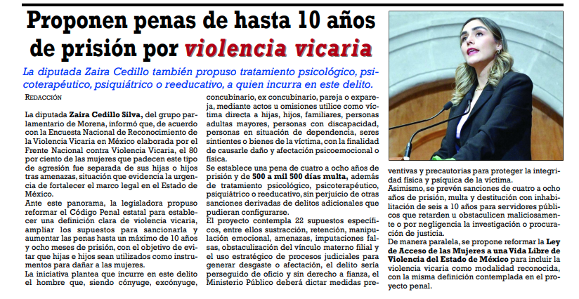 La diputada Zaira Cedillo Silva, del grupo parlamentario de Morena, informó que, de acuerdo con la Encuesta Nacional de Reconocimiento de la Violencia Vicaria en México elaborada por el Frente Nacional contra Violencia Vicaria, el 80 por ciento de las mujeres que padecen este tipo de agresión fue separada de sus hijas o hijos tras amenazas, situación que evidencia la urgencia de fortalecer el marco legal en el Estado de México.