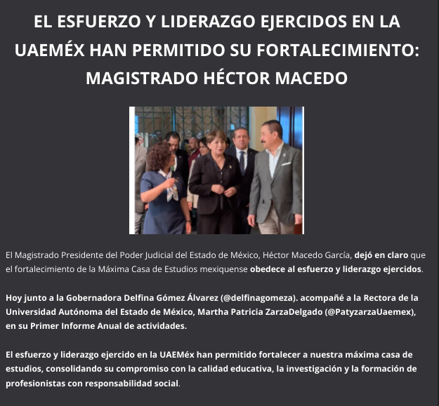 Hoy junto a la Gobernadora Delfina Gómez Álvarez (@delfinagomeza). acompañé a la Rectora de la Universidad Autónoma del Estado de México, Martha Patricia ZarzaDelgado (@PatyzarzaUaemex), en su Primer Informe Anual de actividades.