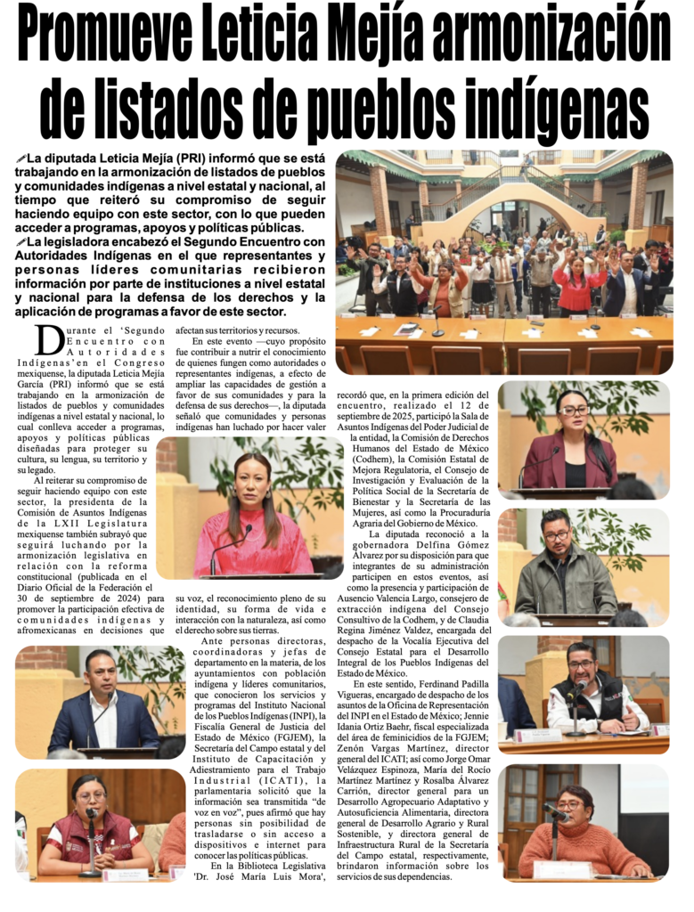 Durante el ‘Segundo Encuentro con Autoridades Indígenas’en el Congreso mexiquense, la diputada Leticia Mejía García (PRI) informó que se está trabajando en la armonización de listados de pueblos y comunidades indígenas a nivel estatal y nacional, lo cual conlleva acceder a programas, apoyos y políticas públicas diseñadas para proteger su cultura, su lengua, su territorio y su legado.