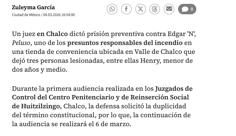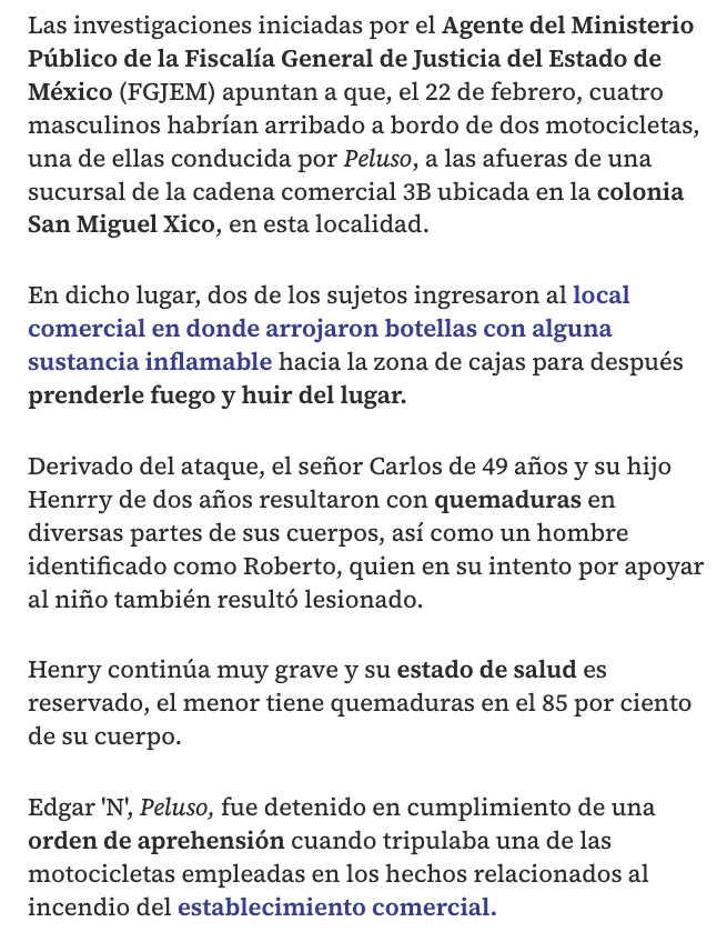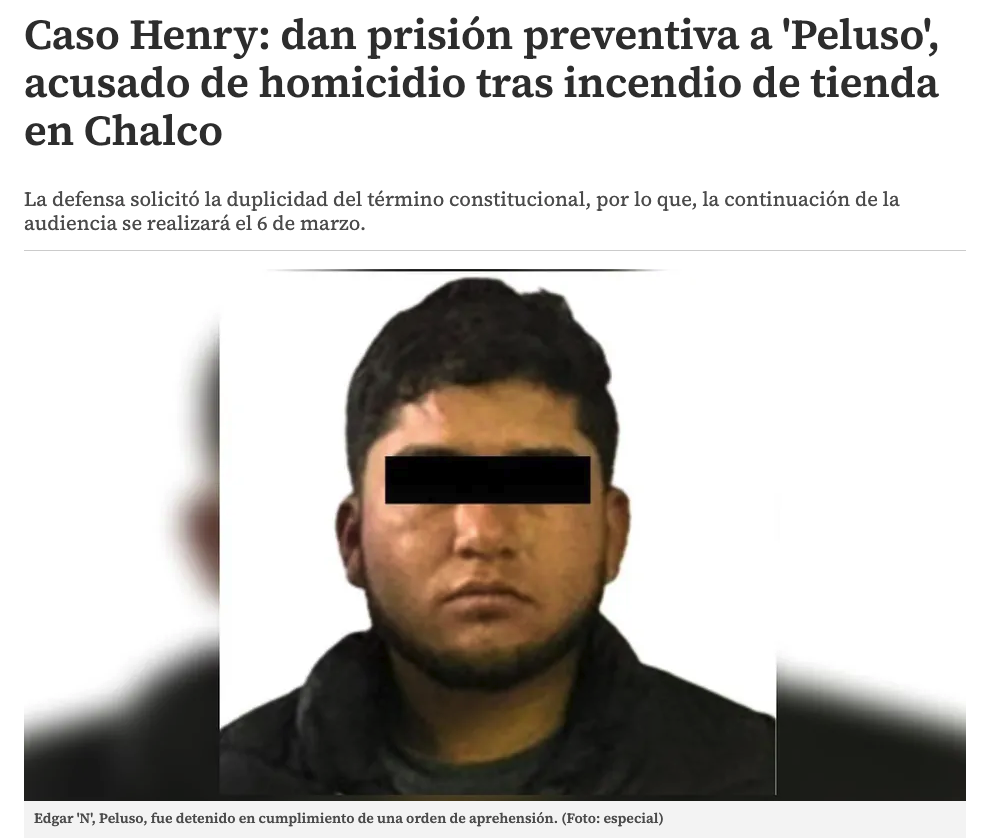Un juez en Chalco dictó prisión preventiva contra Edgar ‘N’, Peluso, uno de los presuntos responsables del incendio en una tienda de conveniencia ubicada en Valle de Chalco que dejó tres personas lesionadas, entre ellas Henry, menor de dos años y medio.