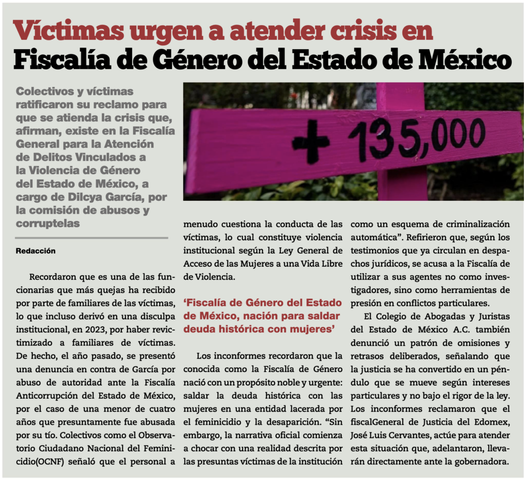 Colectivos y víctimas ratificaron su reclamo para que se atienda la crisis que, afirman, existe en la Fiscalía General para la Atención de Delitos Vinculados a la Violencia de Género del Estado de México, a cargo de Dilcya García, por la comisión de abusos y corruptelas.