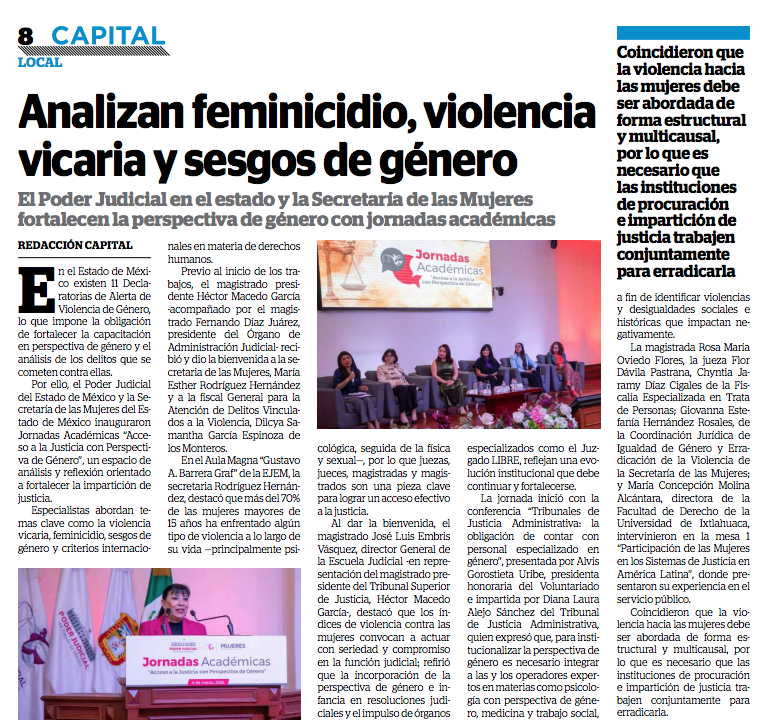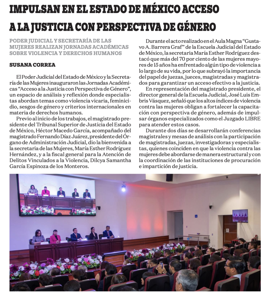 El Poder Judicial del Estado de México y la Secretaría de las Mujeres inauguraron las Jornadas Académicas “Acceso a la Justicia con Perspectiva de Género”, un espacio de análisis y reflexión en el que especialistas abordan temas como violencia vicaria, feminicidio, sesgos de género y criterios internacionales en materia de derechos humanos.