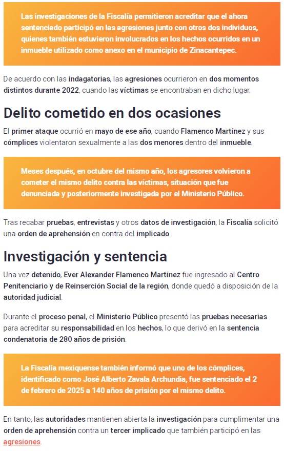 Un juez del Estado de México (EMX) dictó una sentencia de 280 años de prisión contra Ever Alexander Flamenco Martínez, tras ser encontrado culpable del delito de violación en agravio de dos menores de edad, informó la Fiscalía General de Justicia mexiquense (FGJEM).
