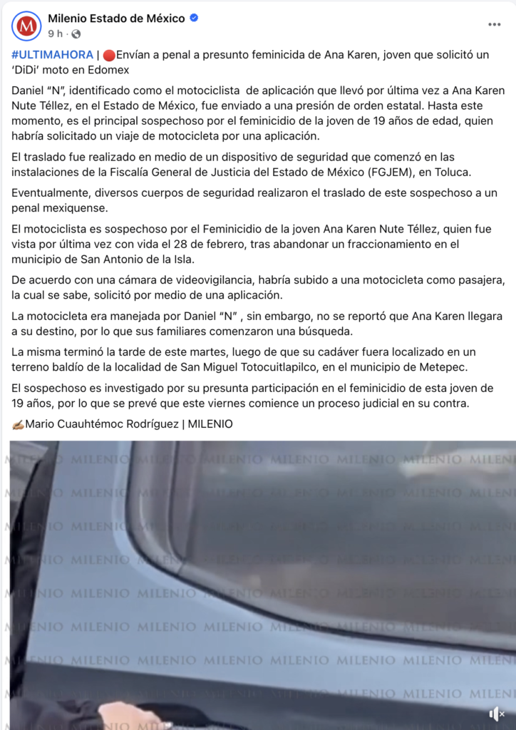 Daniel “N”, identificado como el motociclista de aplicación que llevó por última vez a Ana Karen Nute Téllez, en el Estado de México, fue enviado a una presión de orden estatal. Hasta este momento, es el principal sospechoso por el feminicidio de la joven de 19 años de edad, quien habría solicitado un viaje de motocicleta por una aplicación.