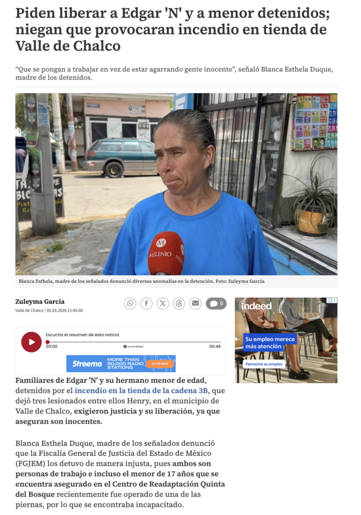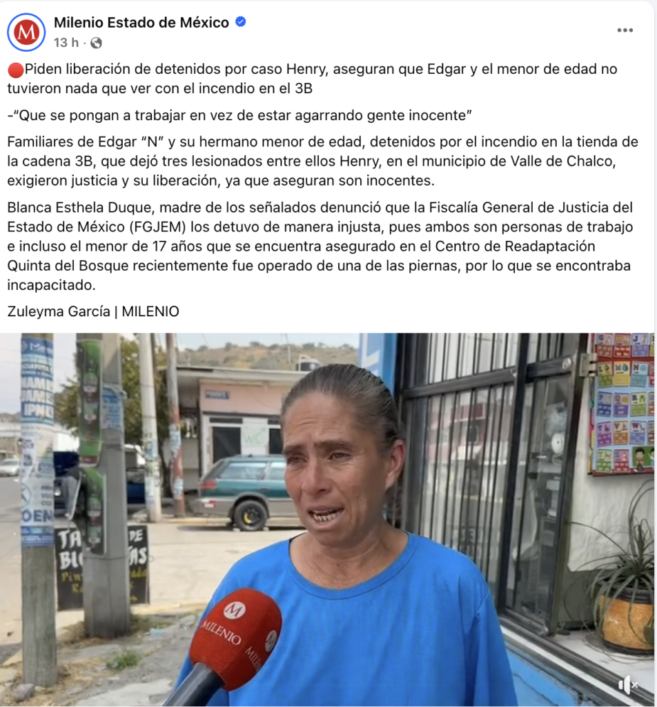 Familiares de Edgar “N” y su hermano menor de edad, detenidos por el incendio en la tienda de la cadena 3B, que dejó tres lesionados entre ellos Henry, en el municipio de Valle de Chalco, exigieron justicia y su liberación, ya que aseguran son inocentes.