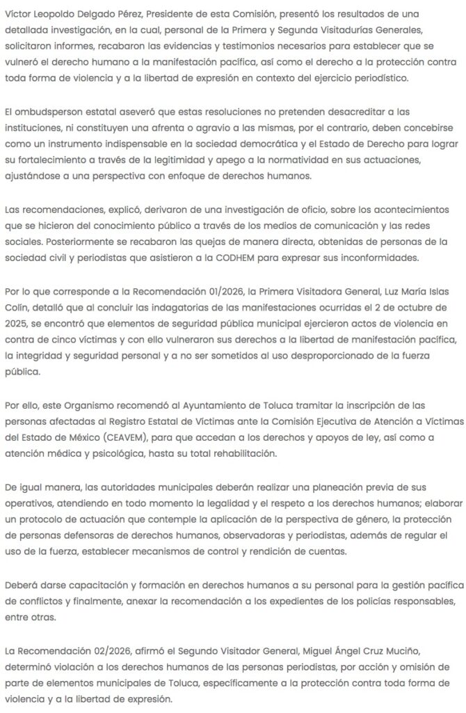 a Comisión de Derechos Humanos del Estado de México (CODHEM) emitió las Recomendaciones 01/2026 y 02/2026, ambas dirigidas al ayuntamiento de Toluca, tras acreditarse que existieron violaciones a derechos humanos por parte de elementos de seguridad pública municipal, durante la marcha del 2 de octubre de 2025 realizada en la capital mexiquense.