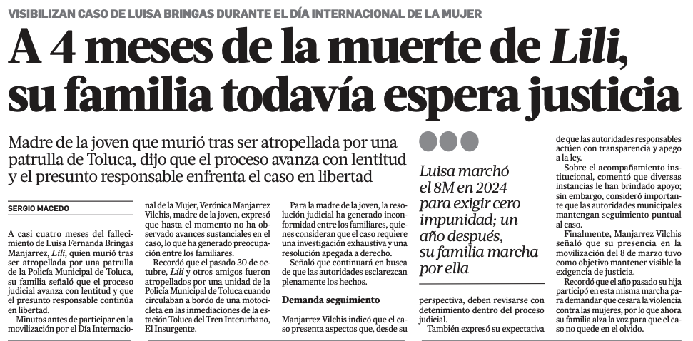 A casi cuatro meses del fallecimiento de Luisa Fernanda Bringas Manjarrez, Lili, quien murió tras