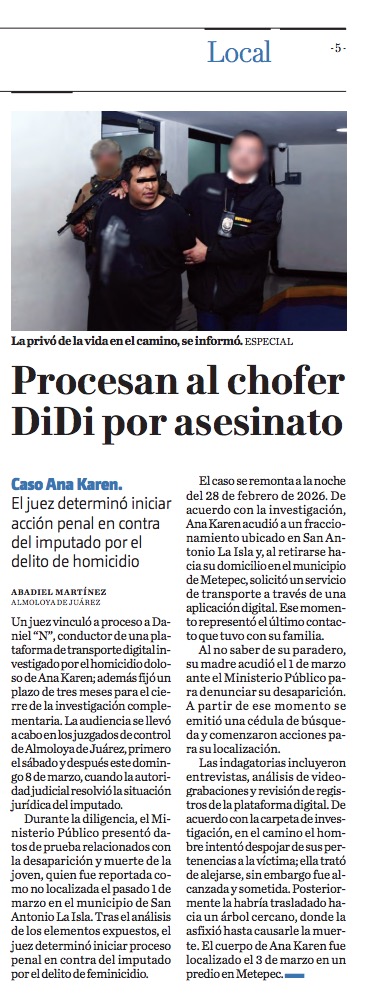 Un juez del Estado de México vinculó a proceso a Daniel “N”, conductor registrado en la plataforma DiDi, por su presunta participación en el feminicidio de una mujer de iniciales A.K.N.T., quien fue reportada como desaparecida el 1 de marzo y localizada sin vida dos días después en el municipio de Metepec.