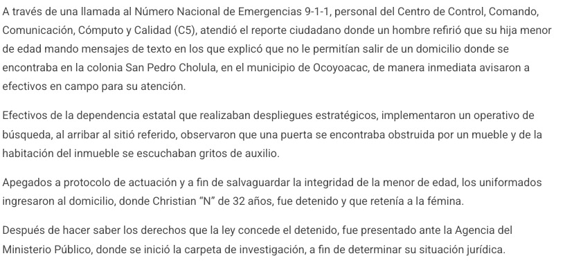 Derivado de una solicitud de ayuda elementos de la Secretaría de Seguridad del Estado de México (SSEM), rescataron a una menor de edad al parecer privada de su libertad, durante la intervención detuvieron a un hombre que al parecer la mantenía cautiva.