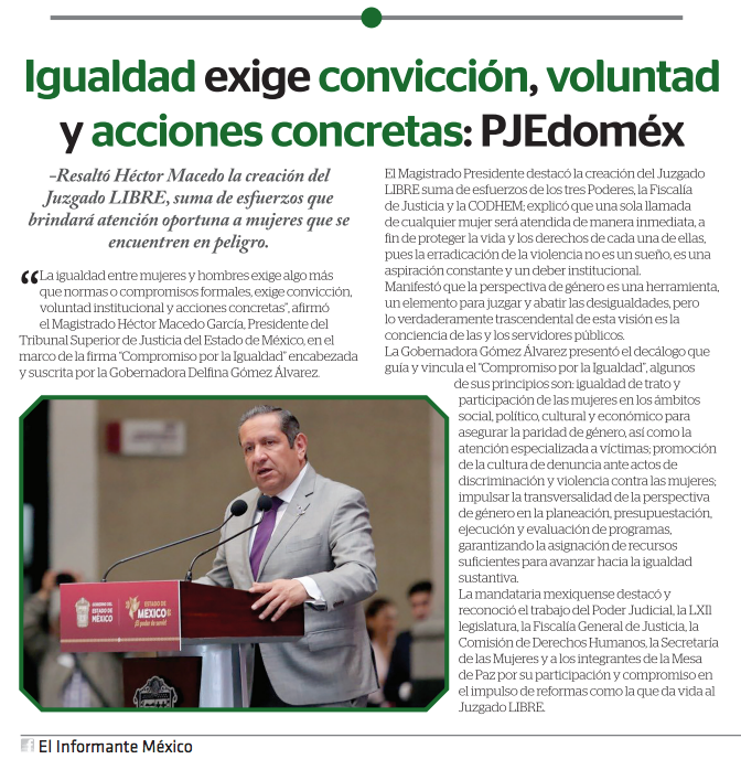 “La igualdad entre mujeres y hombres, exige algo más que normas o compromisos formales, exige convicción, voluntad institucional y acciones concretas”, afirmó el Magistrado Héctor Macedo García, Presidente del Tribunal Superior de Justicia del Estado de México, en el marco de la firma “Compromiso por la Igualdad” encabezada y suscrita por la Gobernadora Delfina Gómez Álvarez.