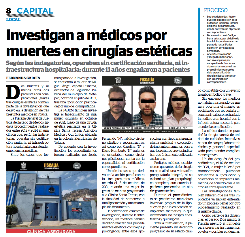 La Fiscalía General de Justicia del Estado de México informó que se ejercitó acción penal en contra de tres presuntos médicos cirujanos identificados como Jesús Fernando “N”, Carolina “N” y Diego “N”, por su presunta responsabilidad en la muerte de dos pacientes y lesiones en otros tres, a raíz de procedimientos quirúrgicos estéticos realizados entre los años 2013 y 2024, practicados en una clínica que no contaba con las certificaciones correspondientes para albergar este