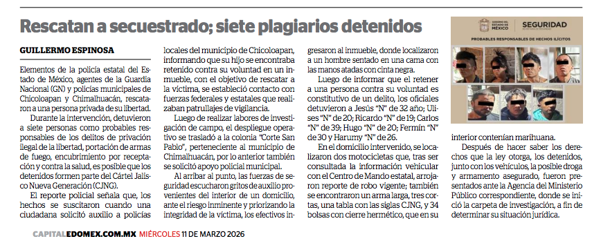 Un hombre que se encontraba privado de su libertad fue rescatado durante un operativo de seguridad en el municipio de Chimalhuacán, donde además fueron detenidas siete personas presuntamente vinculadas con el Cártel Jalisco Nueva Generación (CJNG), informó la Secretaría de Seguridad del Estado de México (SSEM).