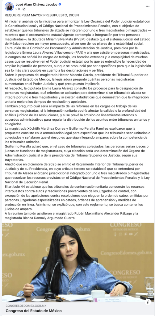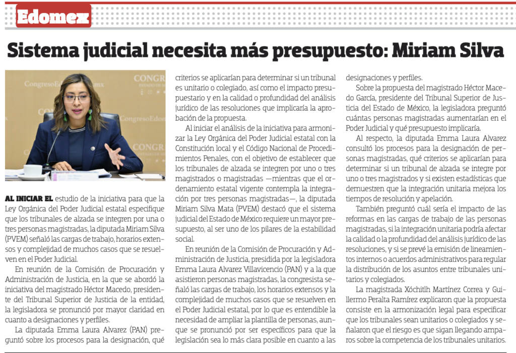 Al iniciar el análisis de la iniciativa para armonizar la Ley Orgánica del Poder Judicial estatal con la Constitución local y el Código Nacional de Procedimientos Penales, con el objetivo de establecer que los tribunales de alzada se integren por uno o tres magistrados o magistradas —mientras que el ordenamiento estatal vigente contempla la integración por tres personas magistradas—, la diputada Miriam Silva Mata (PVEM) destacó que el sistema judicial del Estado de México requiere un mayor presupuesto, al ser uno de los pilares de la estabilidad social.