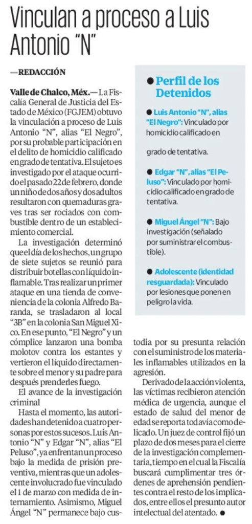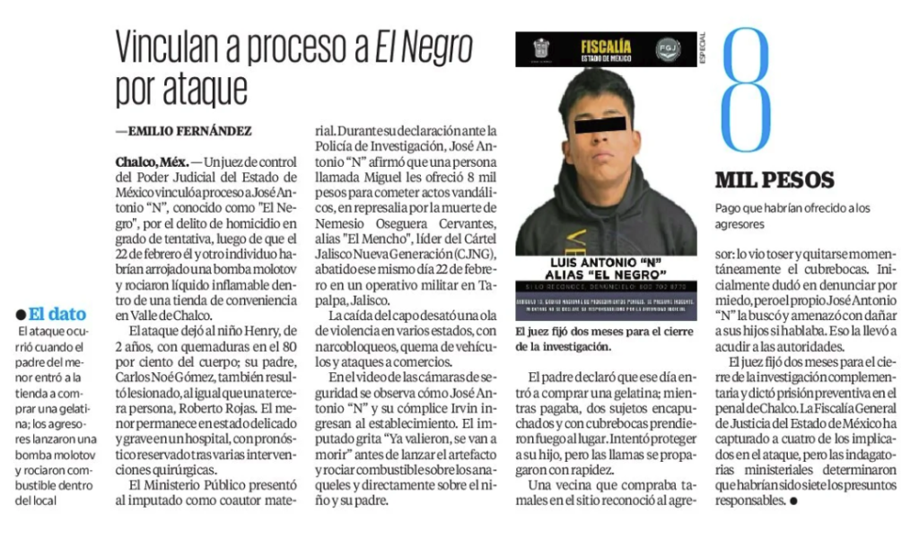 Un juez de control del poder judicial del Estado de México dictó auto de vinculación a proceso en contra de Luis Antonio ‘N’, alias El Negro, acusado de homicidio en grado de tentativa en contra del menor de edad, Henry, y su padre en Valle de Chalco, Estado de México.