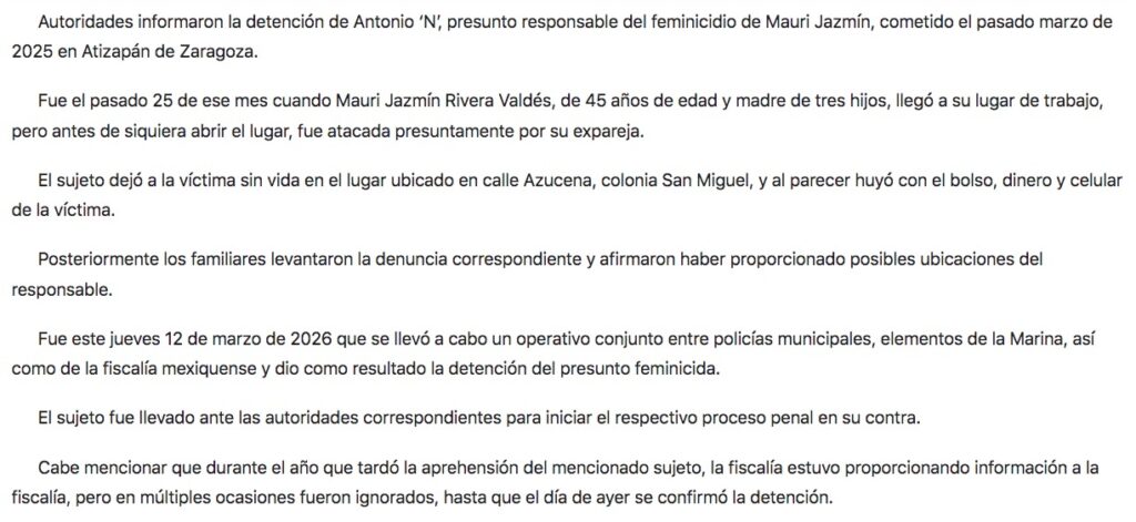 Autoridades informaron la detención de Antonio ‘N’, presunto responsable del feminicidio de Mauri Jazmín, cometido el pasado marzo de 2025 en Atizapán de Zaragoza.