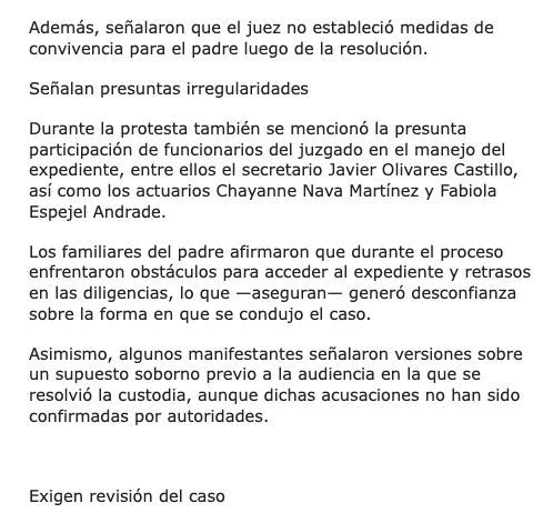 Los inconformes señalaron que la decisión fue tomada por el juez Óscar Cueto Cruz, pese a que, aseguran, los niños llevaban alrededor de ocho meses viviendo con su padre y durante la audiencia de “escucha del menor” habrían expresado su intención de permanecer con él.
