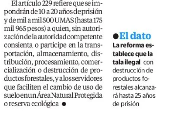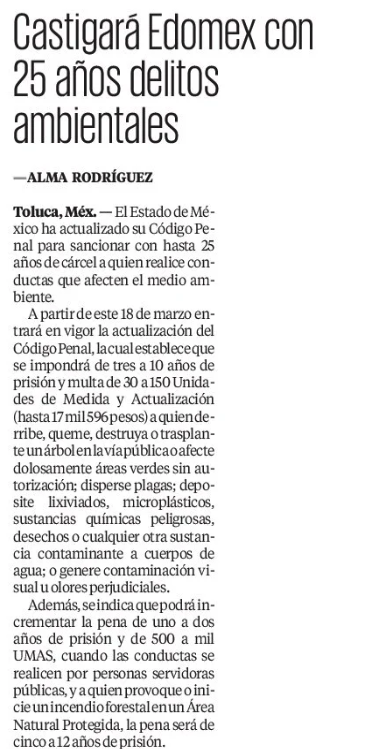 A partir del este 18 de marzo entrará en vigor la actualización del Código Penal, la cual establece que se impondrá de tres a 10 años de prisión y multa de 30 a 150 unidades de Medida y Actualización (hasta 17 mil 596) a quienes derriben, queme, destruya o transplante un árbol en la vía pública o afecte dolosamente áreas verdes sin autorización; disperse plagas; deposite lixiviados, microplásticos, sustancias químicas peligrosas, desechos o cualquier otra sustancia contaminante a cuerpos de agua; o genere contaminación visual u olores perjudiciales.