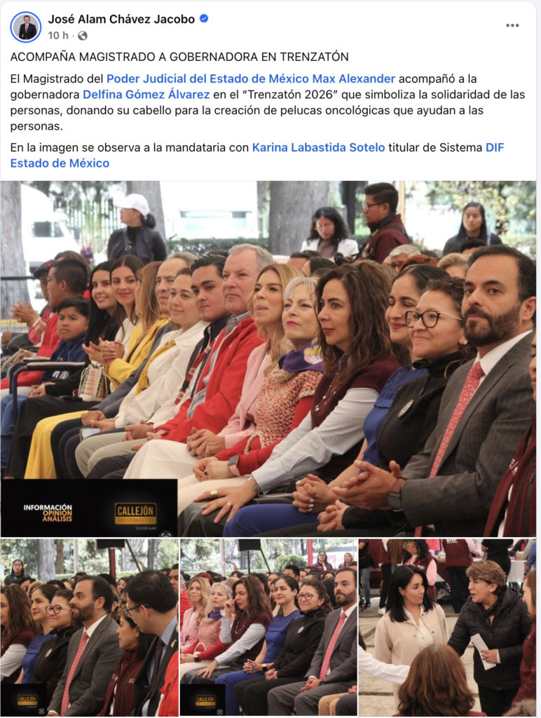 El Magistrado del Poder Judicial del Estado de México Max Alexander acompañó a la gobernadora Delfina Gómez Álvarez en el “Trenzatón 2026” que simboliza la solidaridad de las personas, donando su cabello para la creación de pelucas oncológicas que ayudan a las personas.