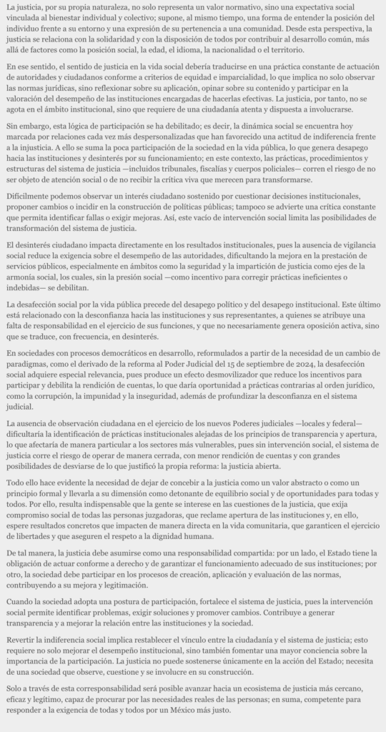 La justicia, por su propia naturaleza, no solo representa un valor normativo, sino una expectativa social vinculada al bienestar individual y colectivo; supone, al mismo tiempo, una forma de entender la posición del individuo frente a su entorno y una expresión de su pertenencia a una comunidad. Desde esta perspectiva, la justicia se relaciona con la solidaridad y con la disposición de todos por contribuir al desarrollo común, más allá de factores como la posición social, la edad, el idioma, la nacionalidad o el territorio.
