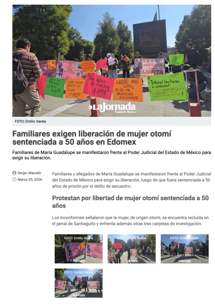 - https://www.diarioevolucion.com.mx/exigen-libertad-para-lupita-mujer-otomi-de-temoaya-victima-de-la-fabricacion-de-delitos/?fbclid=IwY2xjawQrib5leHRuA2FlbQIxMQBzcnRjBmFwcF9pZBAyMjIwMzkxNzg4MjAwODkyAAEejDMI3g7hk1a5CLYURfa4zyrurUi-vzB_LnfrtkQhAJFL2WqTi7gfRkTiBT4_aem_I033MSYtwuswosio8m4hSg