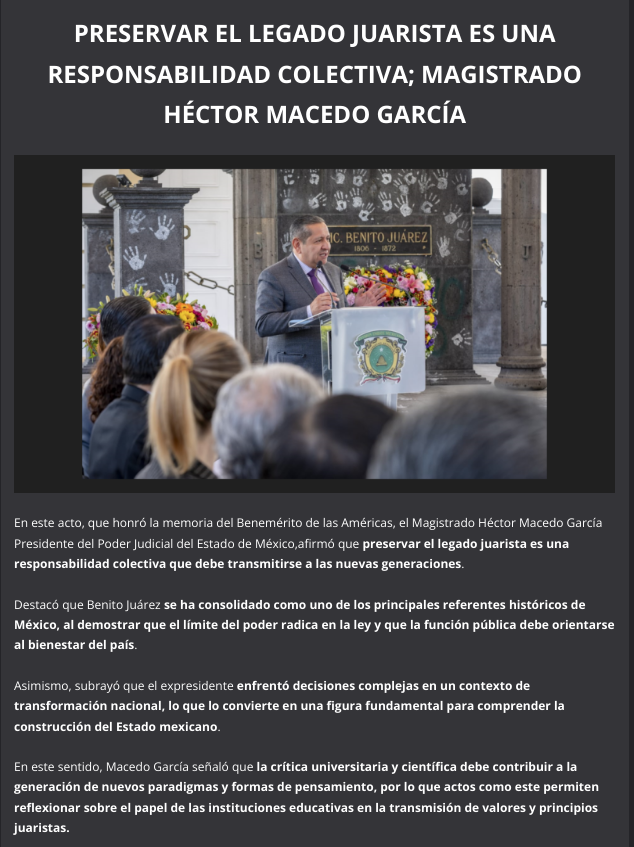 En este acto, que honró la memoria del Benemérito de las Américas, el Magistrado Héctor Macedo García Presidente del Poder Judicial del Estado de México,afirmó que preservar el legado juarista es una responsabilidad colectiva que debe transmitirse a las nuevas generaciones.