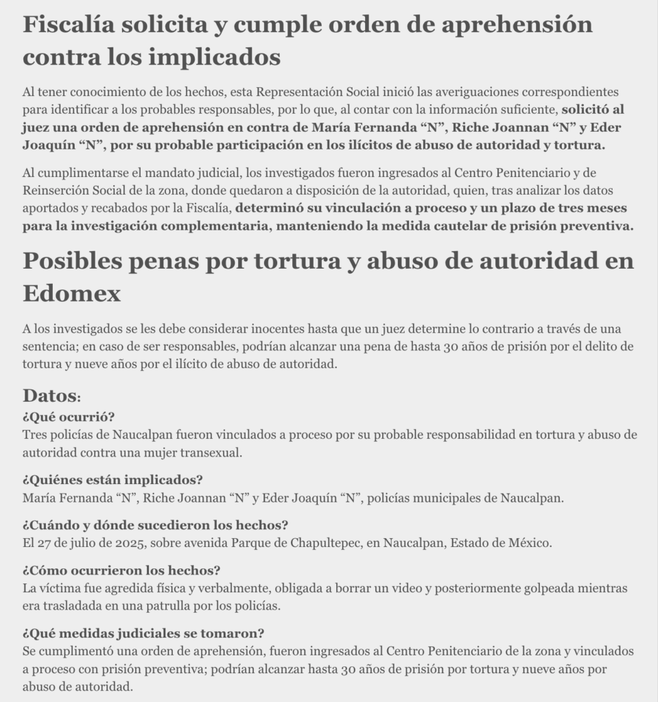 La Fiscalía General de Justicia del Estado de México (FGJEM) obtuvo la vinculación a proceso de tres sujetos identificados como María Fernanda “N”, Riche Joannan “N” y Eder Joaquín “N”, quienes eran policías municipales de Naucalpan, por su probable responsabilidad en los delitos de abuso de autoridad y tortura, hechos cometidos en agravio de una mujer transexual.