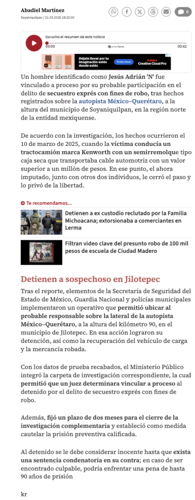 Un hombre identificado como Jesús Adrián ‘N’ fue vinculado a proceso por su probable participación en el delito de secuestro exprés con fines de robo, tras hechos registrados sobre la autopista México–Querétaro, a la altura del municipio de Soyaniquilpan, en la región norte de la entidad mexiquense.