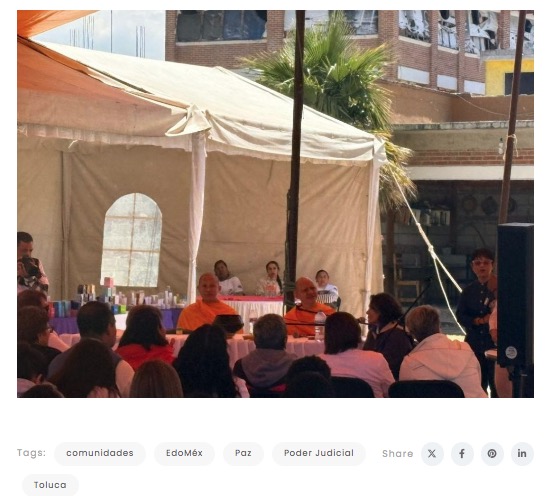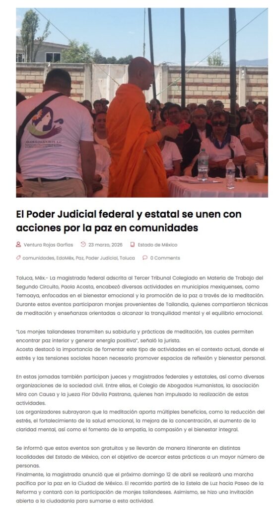 La magistrada federal adscrita al Tercer Tribunal Colegiado en Materia de Trabajo del Segundo Circuito, Paola Acosta, encabezó diversas actividades en municipios mexiquenses, como Temoaya, enfocadas en el bienestar emocional y la promoción de la paz a través de la meditación.