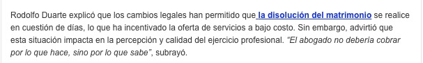 La facilidad legal para disolver el matrimonio en la actualidad ha propiciado la proliferación de servicios jurídicos de bajo costo que, advierten especialistas, demeritan el ejercicio profesional del derecho. Integrantes de la Barra de Abogados del Estado de México señalaron que algunos litigantes ofrecen divorcios a precios que rondan los cinco mil pesos, incluso promocionados en mantas colocadas en la vía pública.