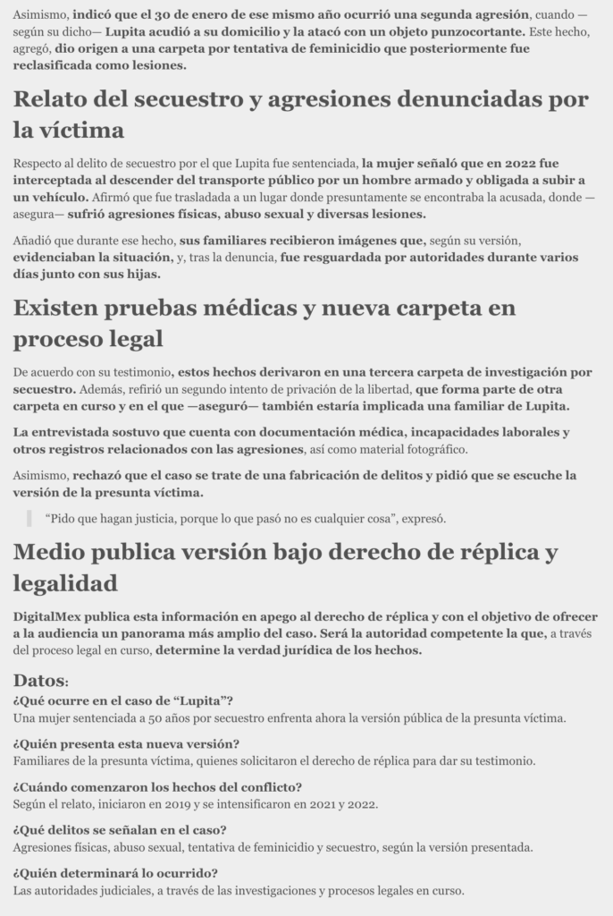 El caso por el que María Guadalupe “N”, conocida como “Lupita”, fue sentenciada a 50 años de prisión por el delito de secuestro, suma ahora la versión de la presunta víctima, luego de que familiares solicitaran a DigitalMex un espacio para ser escuchados.