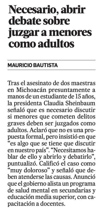 Tras el asesinato de dos maestras en Michoacán presuntamente a manos de un estudiante de 15 años, la presidenta Claudia Sheinbaum señaló que es necesario discutir si menores que cometen delitos graves deben ser juzgados como adultos. Aclaró que no es una propuesta formal, pero insistió en que “es algo que se tiene que discutir en nuestro país”. “Necesitamos hablar de ello y abrirlo y debatirlo”, puntualizó. Calificó el caso como “muy doloroso” y señaló que debe atenderse las causas de manera integral, más allá del castigo. Indicó que el joven habría planeado el ataque y buscaba a las víctimas. Anunció que el gobierno alista un programa de salud mental en secundarias y educación media superior, con capacitación a docentes y guías para estudiantes y familias. El objetivo es prevenir que hechos similares se repitan mediante atención temprana y acompañamiento psicológico.