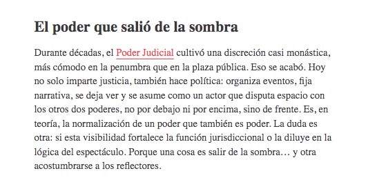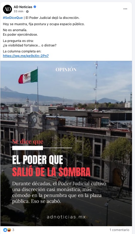 Durante décadas, el Poder Judicial cultivó una discreción casi monástica, más cómodo en la penumbra que en la plaza pública. Eso se acabó. Hoy no solo imparte justicia, también hace política: organiza eventos, fija narrativa, se deja ver y se asume como un actor que disputa espacio con los otros dos poderes, no por debajo ni por encima, sino de frente. Es, en teoría, la normalización de un poder que también es poder. La duda es otra: si esta visibilidad fortalece la función jurisdiccional o la diluye en la lógica del espectáculo. Porque una cosa es salir de la sombra… y otra acostumbrarse a los reflectores.