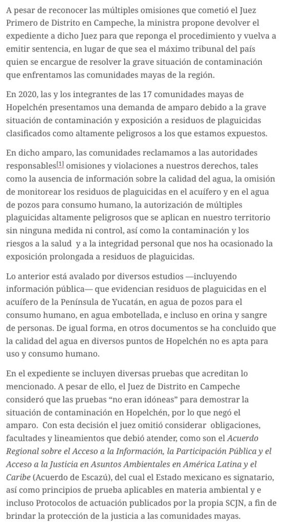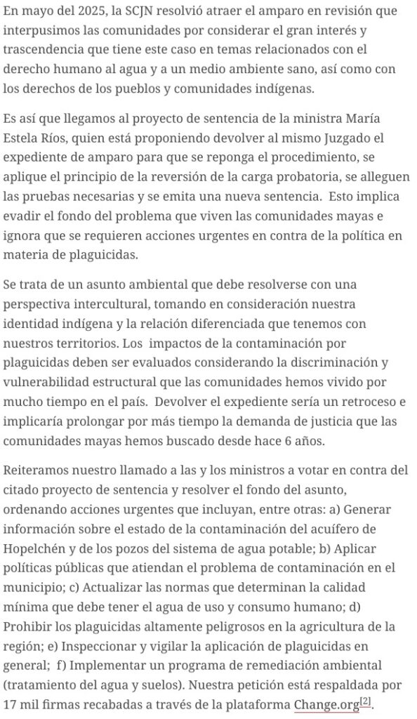 Integrantes de 17 comunidades mayas de Hopelchén hacemos un atento llamado a las y los ministros de la Suprema Corte de Justicia de la Nación (SCJN) para que desechen el proyecto de sentencia de la ministra María Estela Ríos González, listado para discutirse en la sesión de mañana, jueves 26 de marzo, sobre el amparo en revisión que interpusimos por la contaminación del agua por plaguicidas en nuestra región.