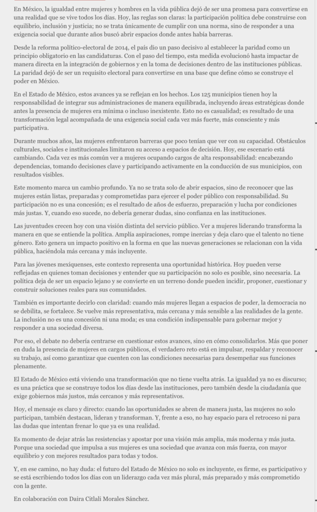 En México, la igualdad entre mujeres y hombres en la vida pública dejó de ser una promesa para convertirse en una realidad que se vive todos los días. Hoy, las reglas son claras: la participación política debe construirse con equilibrio, inclusión y justicia; no se trata únicamente de cumplir con una norma, sino de responder a una exigencia social que durante años buscó abrir espacios donde antes había barreras.