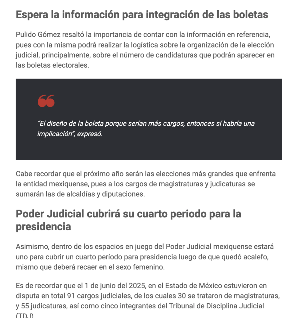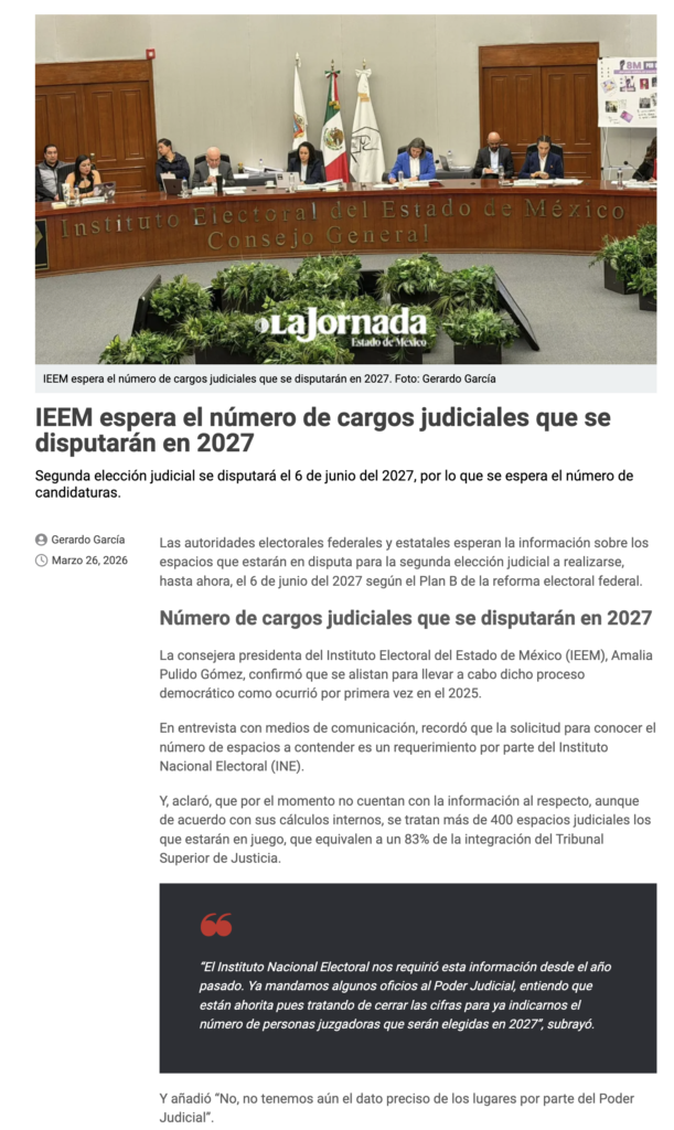 - https://lajornadaestadodemexico.com/ieem-espera-el-numero-de-cargos-judiciales-que-se-disputaran-en-2027/?fbclid=IwY2xjawQzWXpleHRuA2FlbQIxMQBzcnRjBmFwcF9pZBAyMjIwMzkxNzg4MjAwODkyAAEedWaFcHiH5cN-vREM1yilLFjorA2cnQkbSANsmvVf3Li-BRkXVxJ6v4vZ-js_aem_Fu5yUnRkoqBdy9Y0PKbVbg