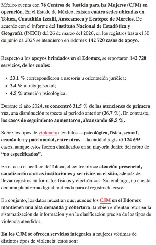 Los Centros de Justicia para las Mujeres en el Estado de México registran alta demanda, con más de 142 000 servicios brindados y retos en la clasificación de casos