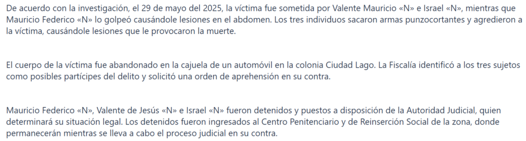 La Fiscalía General de Justicia del Estado de México cumplimentó una orden de aprehensión en contra de Mauricio Federico «N», Valente de Jesús «N» e Israel «N», por su probable participación en el delito de homicidio calificado cometido con ventaja en agravio de un masculino.