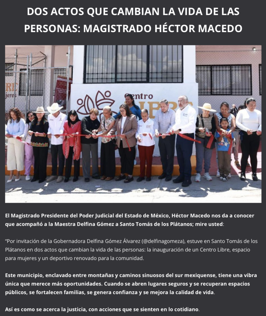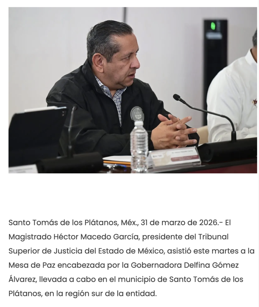 El Magistrado Héctor Macedo García, presidente del Tribunal Superior de Justicia del Estado de México, asistió este martes a la Mesa de Paz encabezada por la Gobernadora Delfina Gómez Álvarez, llevada a cabo en el municipio de Santo Tomás de los Plátanos, en la región sur de la entidad.