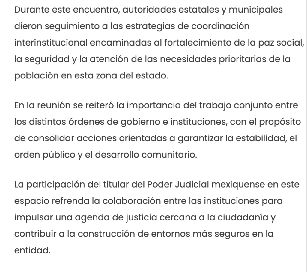 Durante este encuentro, autoridades estatales y municipales dieron seguimiento a las estrategias de coordinación interinstitucional encaminadas al fortalecimiento de la paz social, la seguridad y la atención de las necesidades prioritarias de la población en esta zona del estado.