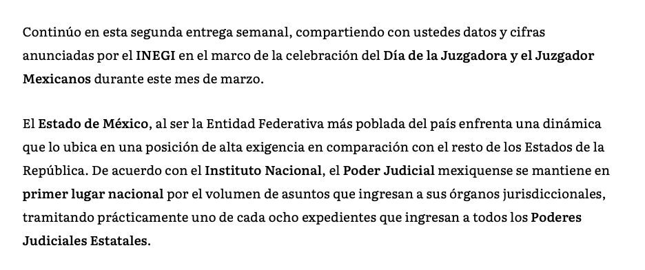 Continúo en esta segunda entrega semanal, compartiendo con ustedes datos y cifras anunciadas por el INEGI en el marco de la celebración del Día de la Juzgadora y el Juzgador Mexicanos durante este mes de marzo.