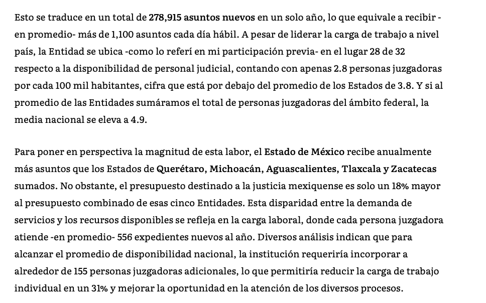 El Estado de México, al ser la Entidad Federativa más poblada del país enfrenta una dinámica que lo ubica en una posición de alta exigencia en comparación con el resto de los Estados de la República. De acuerdo con el Instituto Nacional, el Poder Judicial mexiquense se mantiene enprimer lugar nacional por el volumen de asuntos que ingresan a sus órganos jurisdiccionales, tramitando prácticamente uno de cada ocho expedientes que ingresan a todos los Poderes Judiciales Estatales.