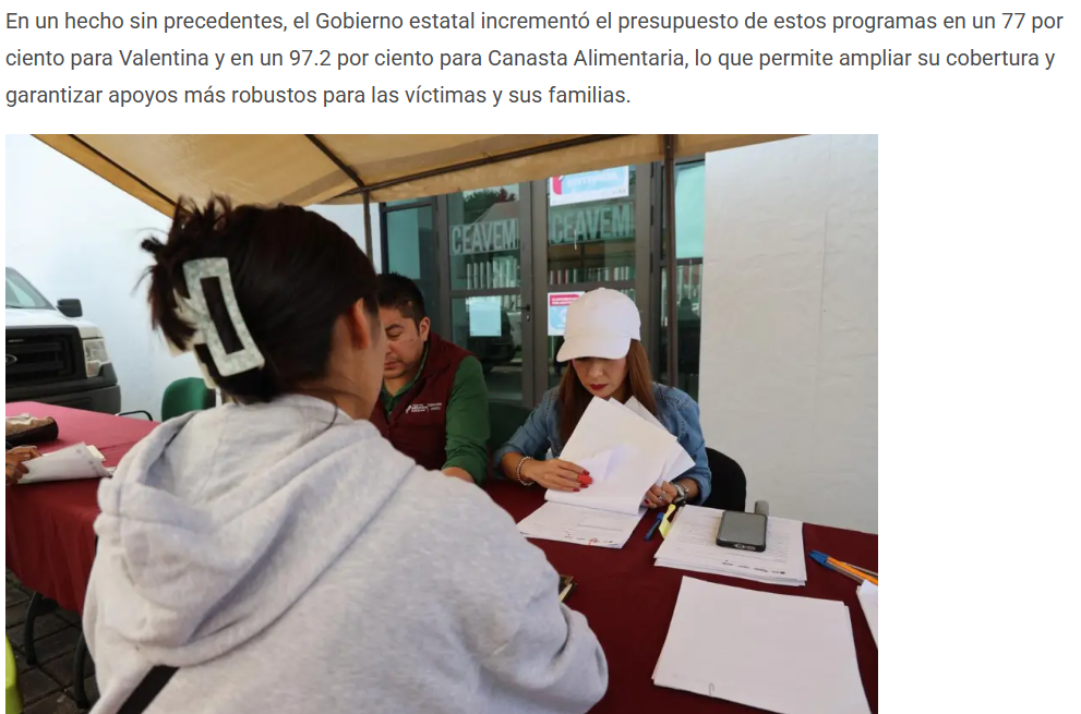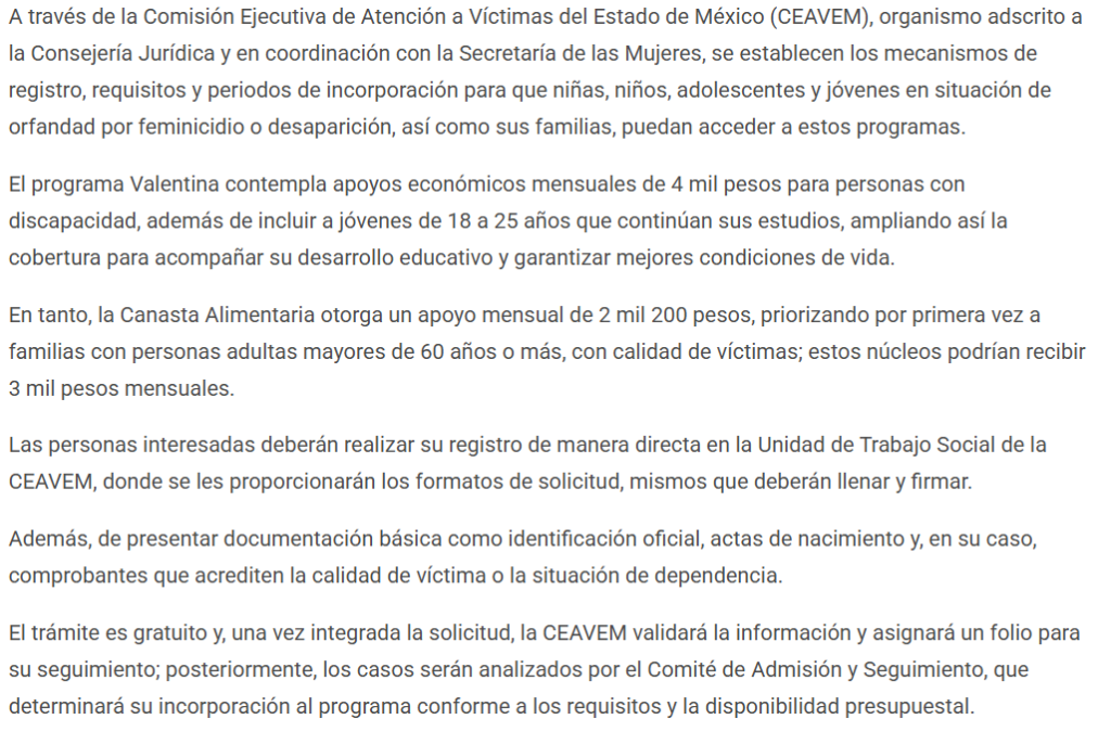 El Gobierno del Estado de México publicó en el Periódico Oficial Gaceta del Gobierno las convocatorias para acceder a los programas Valentina y Canasta Alimentaria para Víctimas del Delito de Feminicidio y Desaparición, fortalecidos este año con un incremento histórico en sus recursos, impulsado por la Gobernadora Delfina Gómez Álvarez