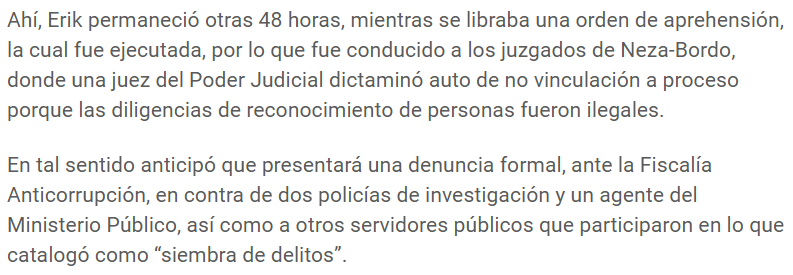El presidente de la Asociación Civil, Ciudadanos uniformados, Iván Chávez Espejel, denunció que policías de Investigación adscritos a la Fiscalía Regional de Nezahualcóyotl, por presunta privación ilegal de la libertad, tortura y corrupción, en agravio de un joven vecino de la localidad, identificado como Erik, a quien acusaron de tres delitos diferentes en sólo 72 horas.