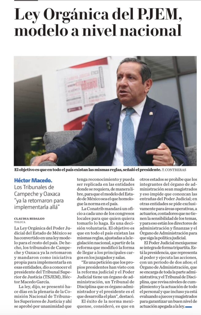 La Ley Orgánica del Poder Judicial del Estado de México se ha convertido en una ley modelo para el resto del país. De hecho, los tribunales de Campeche y Oaxaca ya la retomaron y mandaron como iniciativa propia para implementarla en esas entidades, dio a conocer el presidente del Tribunal Superior de Justicia (TSJEM), Héctor Macedo García.