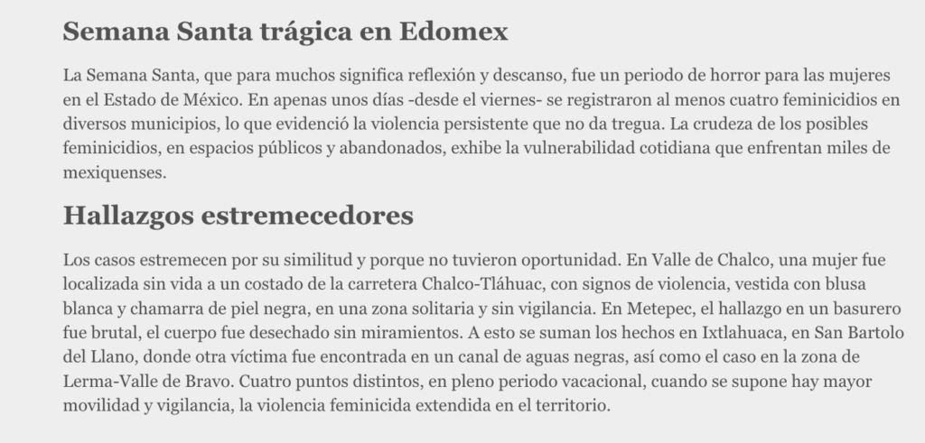 La Semana Santa, que para muchos significa reflexión y descanso, fue un periodo de horror para las mujeres en el Estado de México. En apenas unos días -desde el viernes- se registraron al menos cuatro feminicidios en diversos municipios, lo que evidenció la violencia persistente que no da tregua. La crudeza de los posibles feminicidios, en espacios públicos y abandonados, exhibe la vulnerabilidad cotidiana que enfrentan miles de mexiquenses.