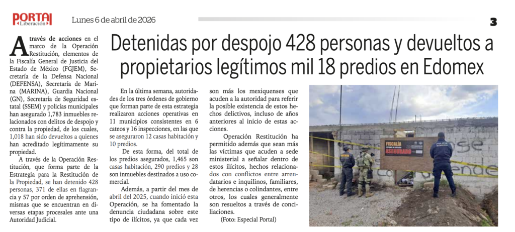 A través de acciones en el marco de la Operación Restitución, elementos de la Fiscalía General de Justicia del Estado de México (FGJEM), Secretaría de la Defensa Nacional (DEFENSA), Secretaría de Marina (MARINA), Guardia Nacional (GN), Secretaría de Seguridad estatal (SSEM) y policías municipales han asegurado 1,783 inmuebles relacionados con delitos de despojo y contra la propiedad, de los cuales, 1,018 han sido devueltos a quienes han acreditado legítimamente su propiedad.