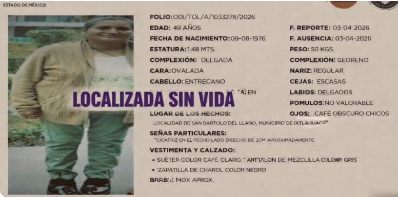 Una mujer identificada como Luz María, de 49 años, fue localizada sin vida en el municipio de Ixtlahuaca, luego de