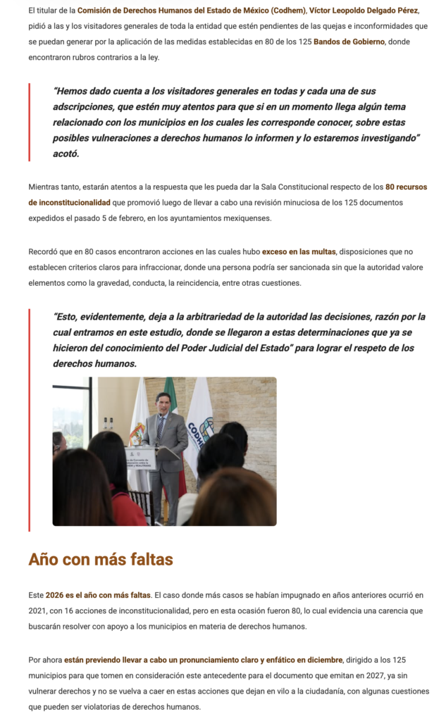 El titular de la Codhem, Víctor Leopoldo Delgado Pérez, pidió a las y los visitadores generales de toda la entidad que estén pendientes de las quejas e inconformidades que se pueden generar por la aplicación de las medidas establecidas en 80 de los 125 Bandos de Gobierno, donde encontraron rubros contrarios a la ley.