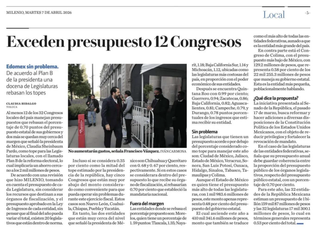 Al menos 12 de los 32 congresos locales del país manejan presupuestos que rebasan el porcentaje de 0.70 puntos del presupuesto estatal de sus gobiernos, y dos más se quedan muy cerca del margen que señaló la presidenta Claudia Sheinbaum Pardo, como tope para las legislaturas locales con el llamado plan B de la reforma electoral, lo cual implicaría un ahorro cercano a los 2 mil millones de pesos.