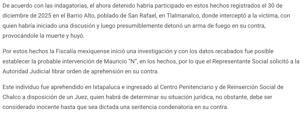 Detienen a Mauricio “N” en Ixtapaluca, presunto responsable de homicidio en Tlalmanalco